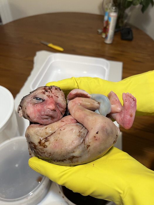 Zwar ist das Geschlecht nicht bekannt, aber das Baby ist in seiner intakten Fruchtblase zu sehen. Vermutlich wurde das Kind getötet, indem die Nabelschnur des Babys durchtrennt und gewartet wurde, bis das Kind schließlich an Herzstillstand verstirbt. Vermutlich war es so, dass die Abtreibungsärzte dabei das Gesetz zur Teilgeburtsabtreibung umgehen wollten, indem sie das Kind töteten, bevor es den Körper der Mutter verlässt.